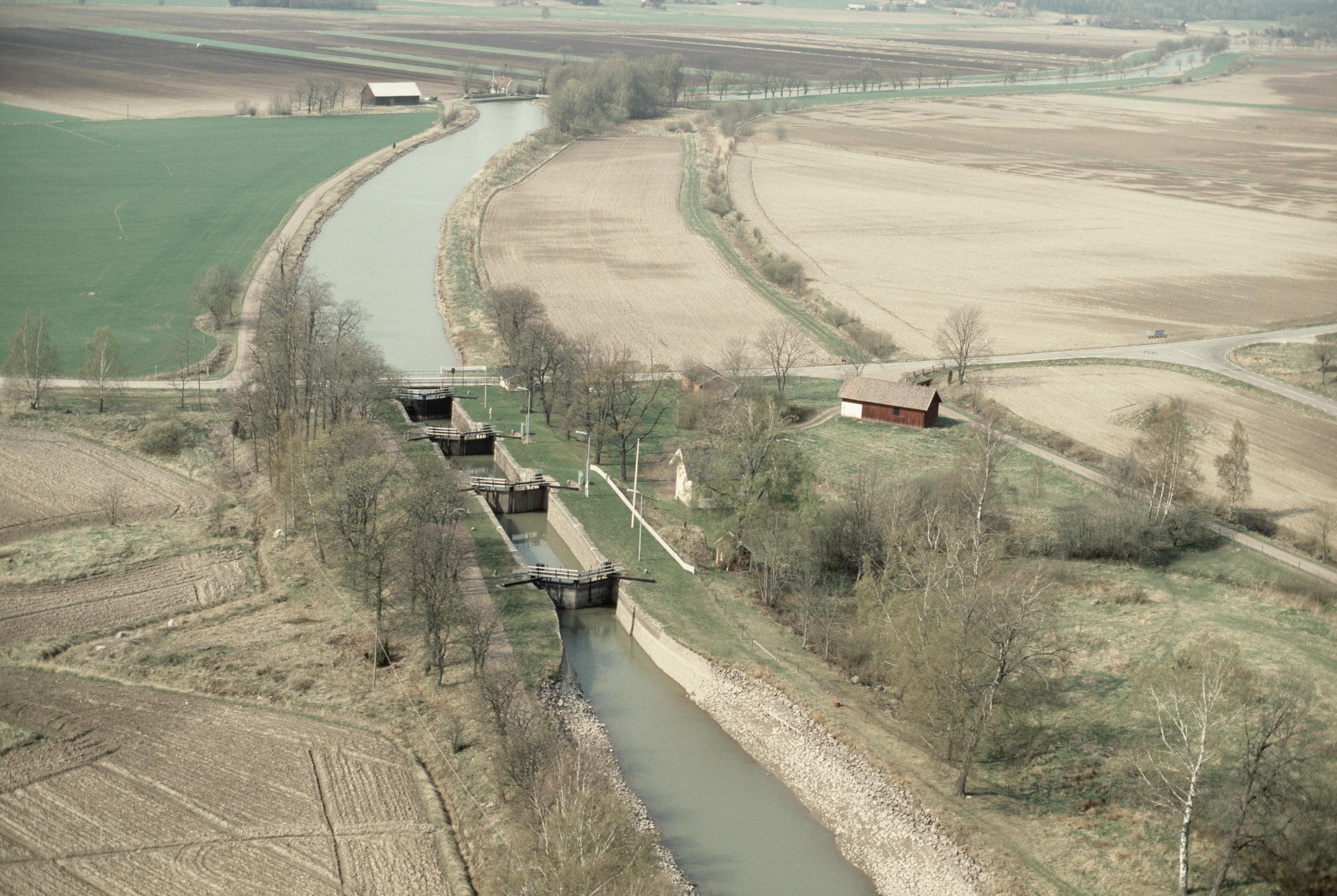 Göta kanal, sluss med bro vid Mårby och Riksberg. Kanalmärke RAÄnr Fredsberg 44:1 till vänster i bildens övre del. Bilden är tagen mot (väderstreck): NV