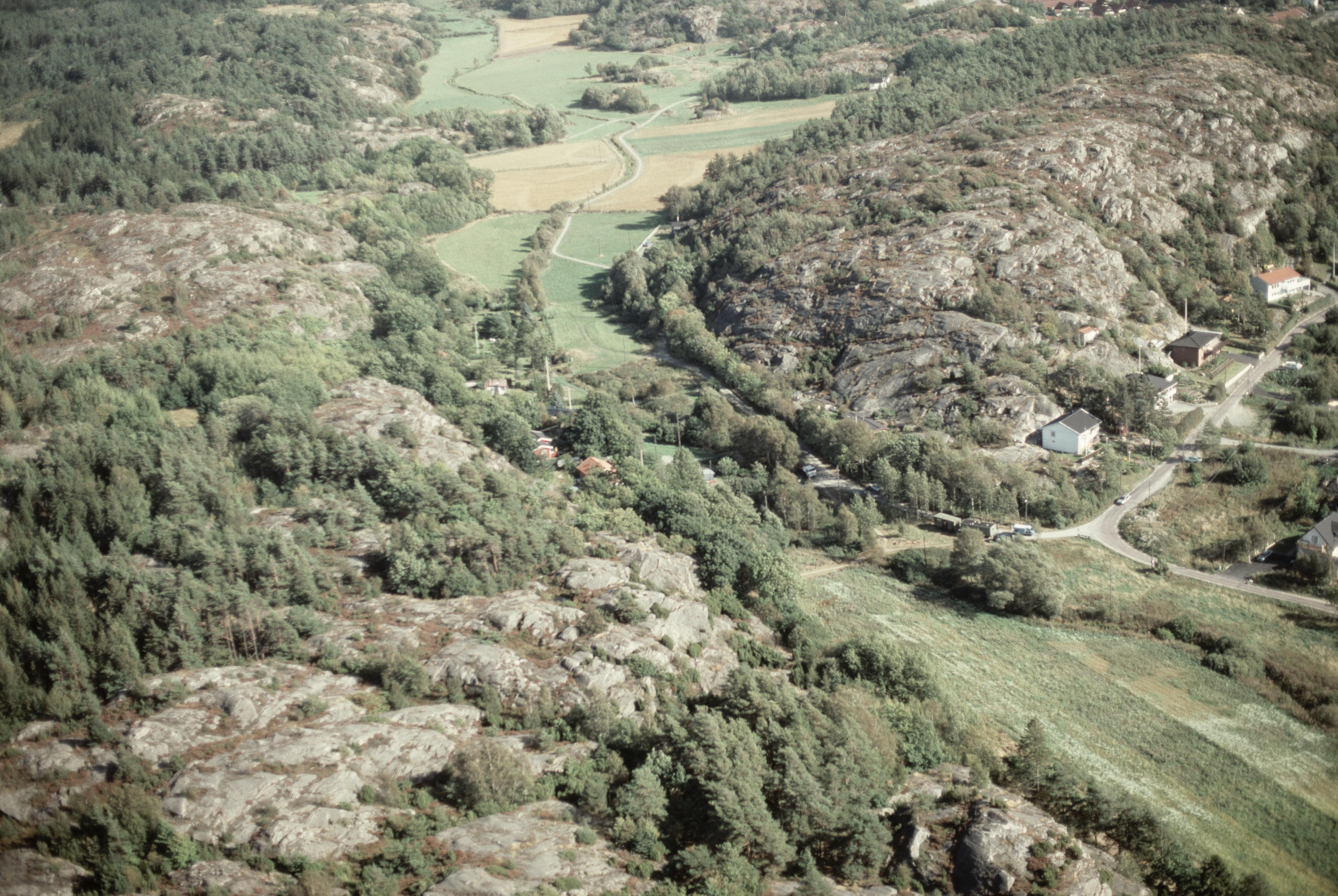 Madbäckens dalgång i sydvästra delen av ön Hisingen. Hällmålningsberget RAÄnr Torslanda 216:1 nere till vänster. Bilden är tagen mot (väderstreck): SO