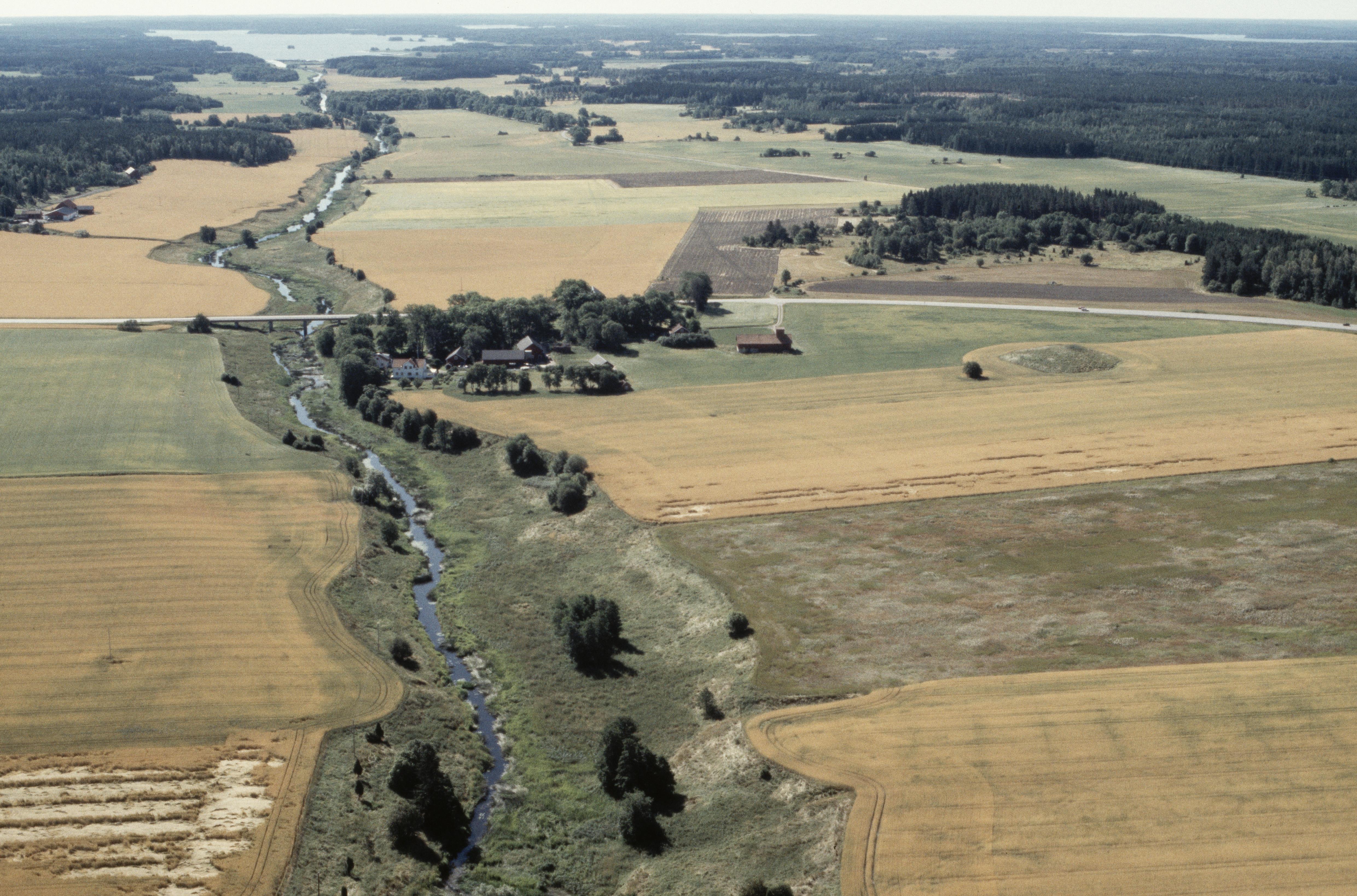 Sagån, till höger Kung Östens hög RAÄnr Björksta 106:1. På vänstra sidan av Sagån: Tillinge sn, Riksintresse-nr C55 i Uppland. Bilden är tagen mot (väderstreck): SSO