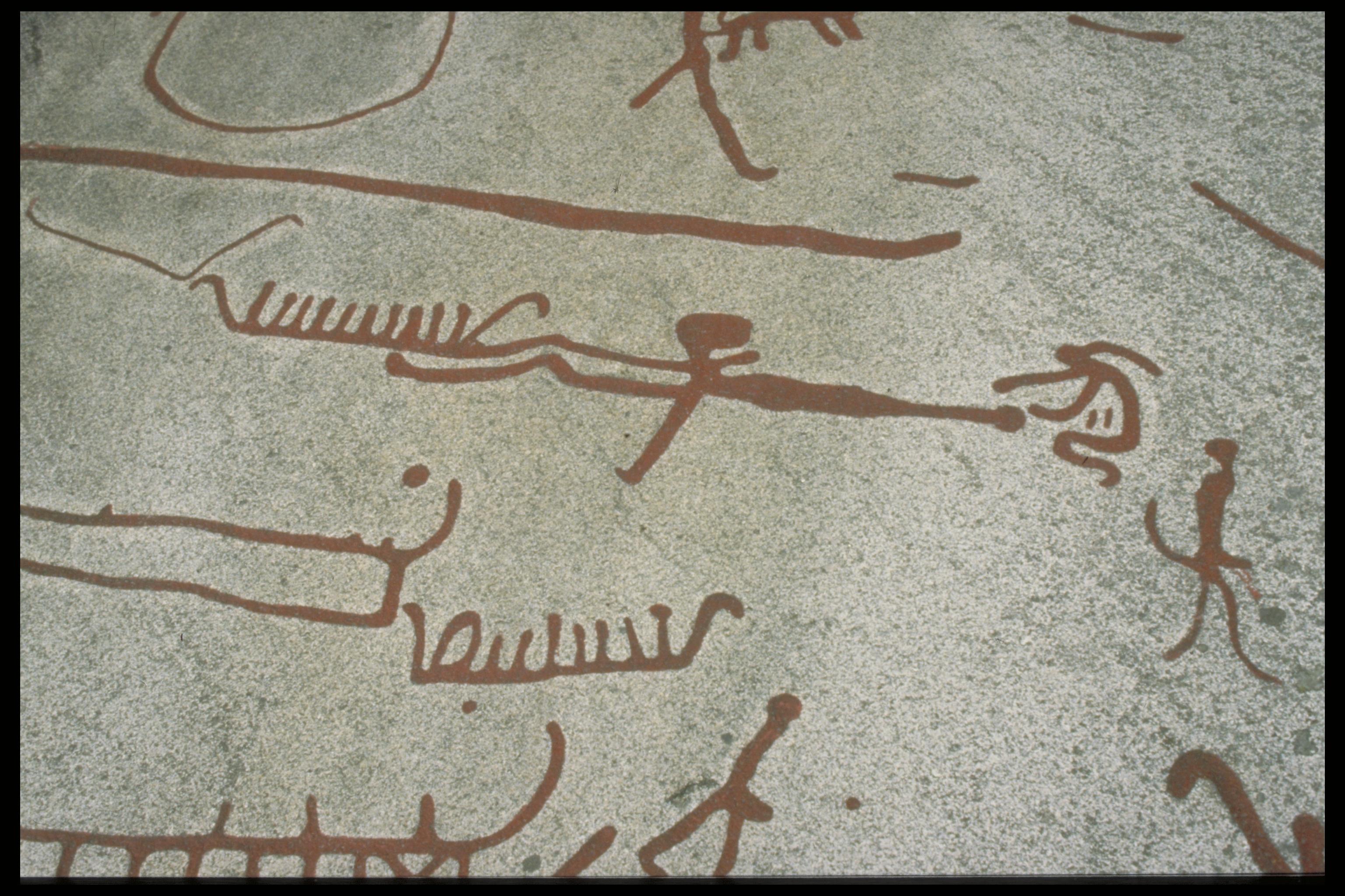 Skeppsfigurer med och utan bemanningsstreck, samt människofigurer, med bl.a. död man och sörjande kvinna med hästsvans. Vitlyckehällen, Tanum 1:1.