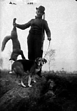 EN JÄGARE MED SITT JAKTBYTE OCH I SÄLLSKAP AV SIN HUND