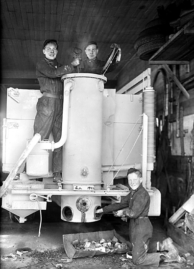 TRE MÄN SOTAR ETT GENGASAGGREGAT AV ETT GENGASAGREGAT
