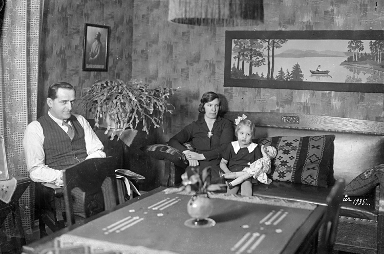 MOR OCH FAR MED SIN LILLA DOTTER, SOM HAR EN DOCKA I FAMNEN.