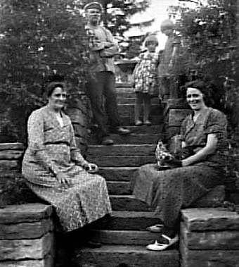 TVÅ KVINNOR EN MAN OCH TVÅ BARN VID EN STENTRAPPA