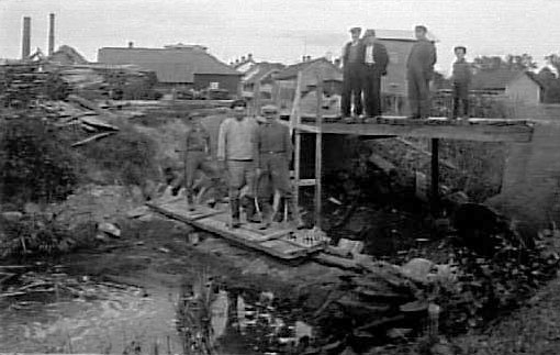 SEX MÄN OCH EN POJKE ARBETAR MED ANLÄGGNINGSARBETE VID VATTENDRAG.