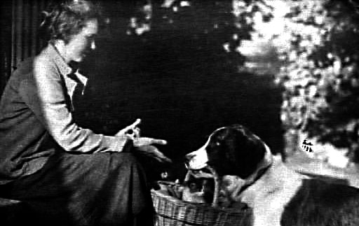 KVINNA SOM SITTER FRAMFÖR EN HUND MED KORG I MUNNEN OCH I KORGEN EN KATT