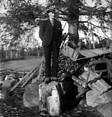 EN MAN STÅENDE PÅ EN HUGGKUBBE