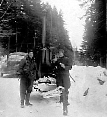 TVÅ MILITÄRER STÅR FRAMFÖR EN ÅNGKOKARE PÅ EN SKOGSVÄG.