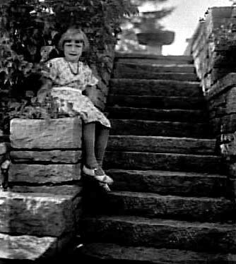 EN LITEN FLICKA SITTER VID EN STENTRAPPA,