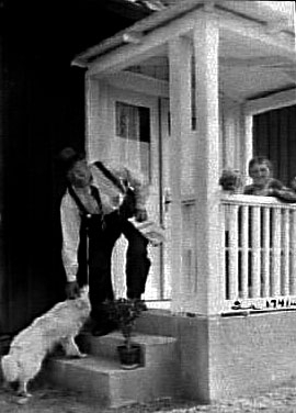 ETT ÄLDRE PAR PÅ VERANDAN MANNEN KLAPPAR SIN HUND