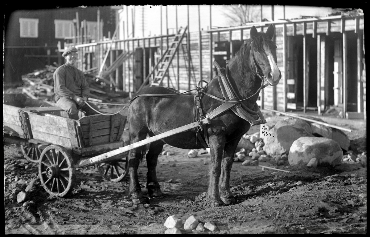 Häst i arbete vid husbygge
