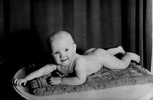 EN NAKEN BABY LIGGANDE PÅ ETT BORD MED ETT TÄCKE UNDER SIG
