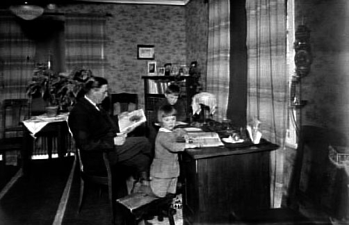 EN FAR MED SINA TVÅ BARN SITTER VID ETT SKRIVBORD.