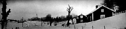 Vy över snöklädd bygd med fattighuset och plitaskomakarns hus till höger.