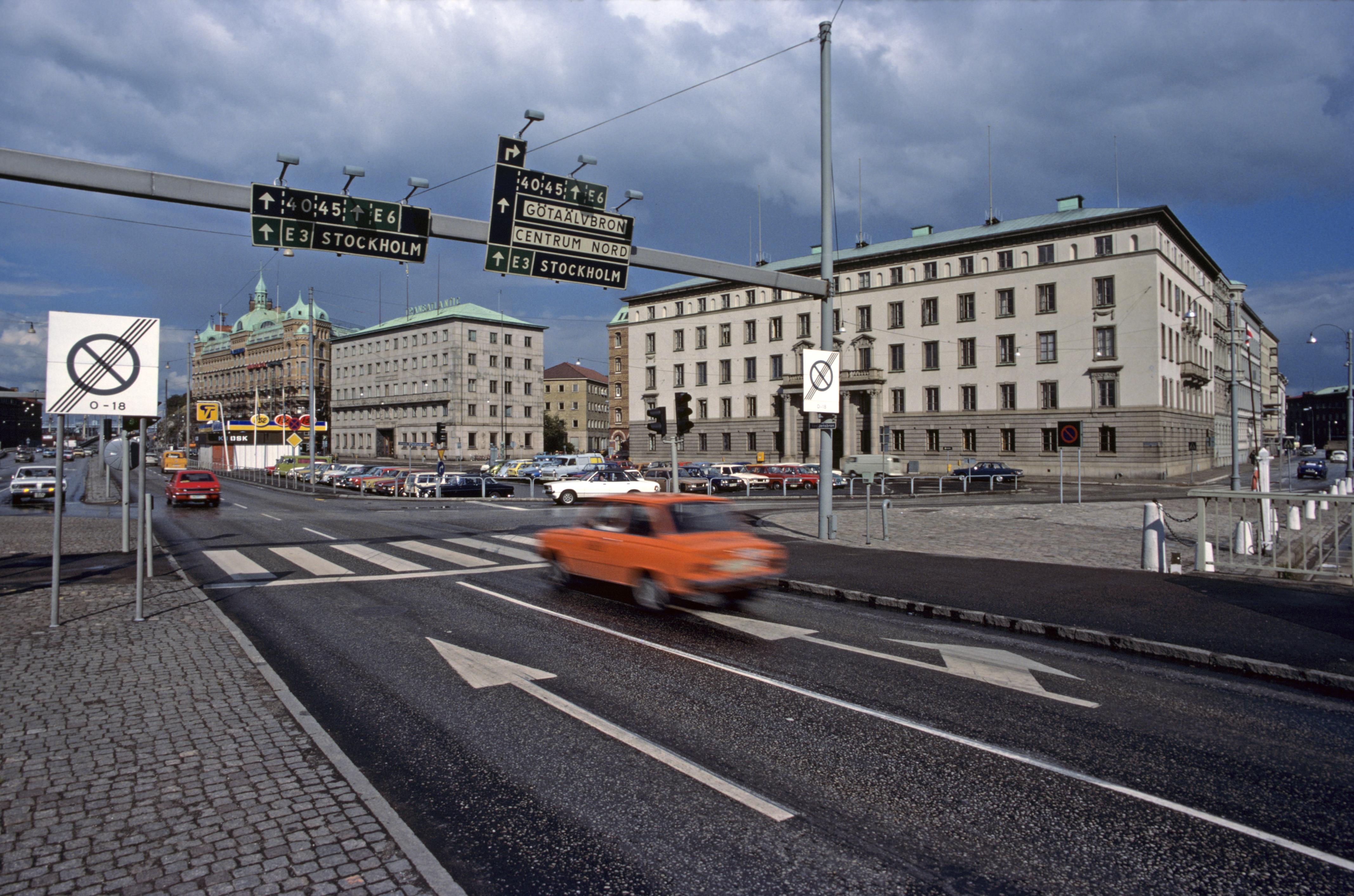Trafik på E3:an. Hovrätten i bakgrunden t.h.