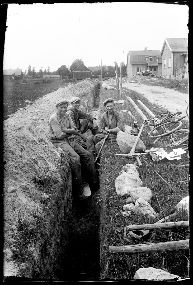 Tre män gräver avloppsdike