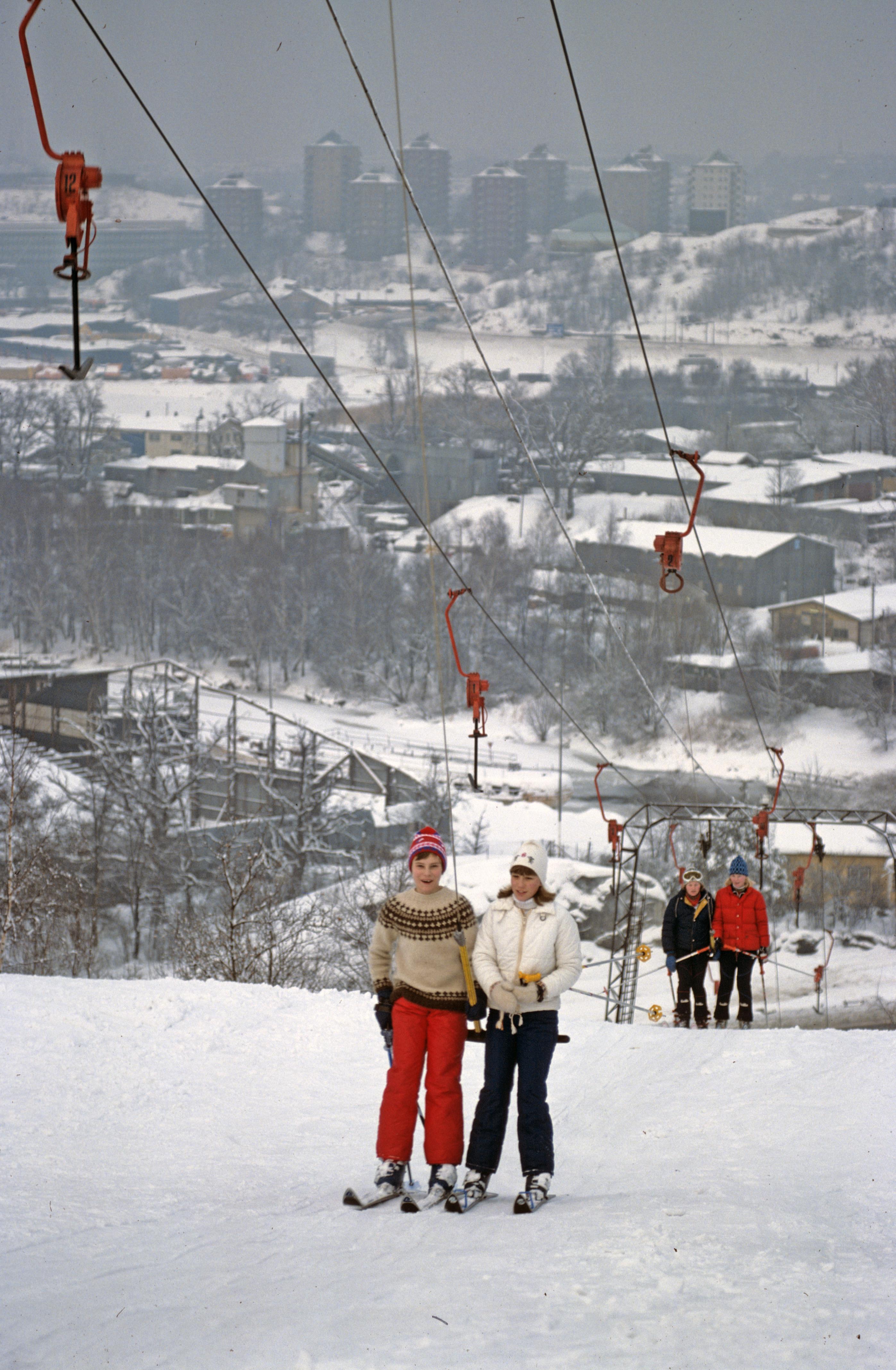 Skidåkare i liften. Bilden troligen från början av 1970-talet.