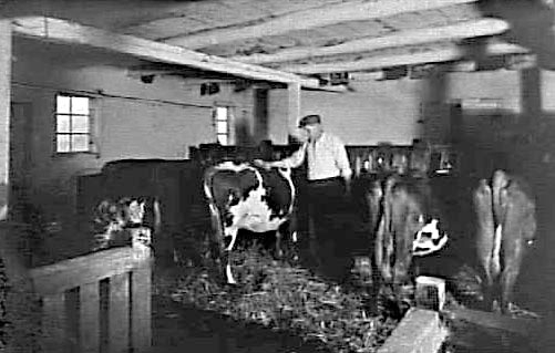 LADUGÅRDSINTERIÖR MED NÅGRA KOR OCH EN MAN