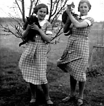 TVÅ KVINNOR MED VAR SIN KATT I FAMNEN