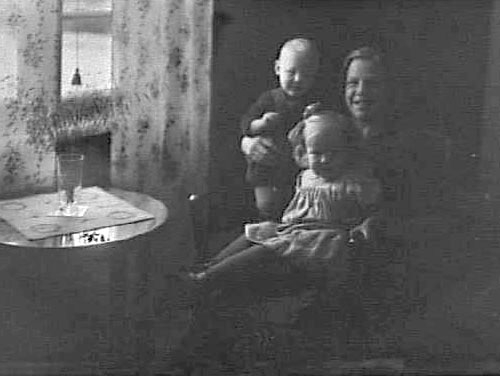 MOR MED TVÅ BARN SITTER VID ETT FÖNSTER