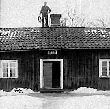 EN SOTARE STÅR VID SKORSTENEN PÅ TAKET HOS ANDERS KARLSSON I HAGEN, GÖTLUNDA. 1948.