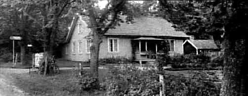 HUS SOM INRYMMER TELEFONSTATION, SKYLT TILL VÄNSTER VID VÄGEN