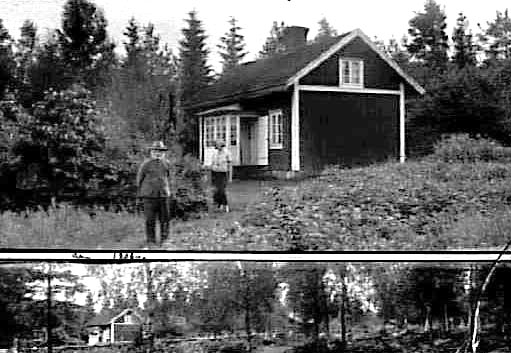 LITET BOSTADSHUS I SKOGEN. EN MAN OCH KVINNA STÅR FRAMFÖR HUSET
