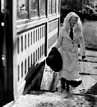 EN FLICKA GÅR UPPFÖR EN TRAPPA OCH BÄR PÅ EN VIDBRÄTTAD HATT