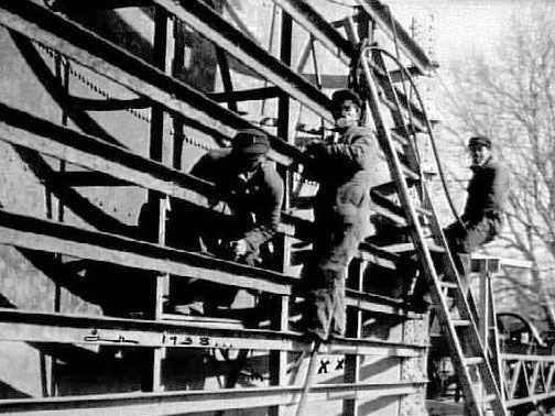 TRE MÄN KLÄDDA I ANDNINGSSKYDD JOBBAR MED EN BÅT, SANNOLIKT I SJÖTORP.