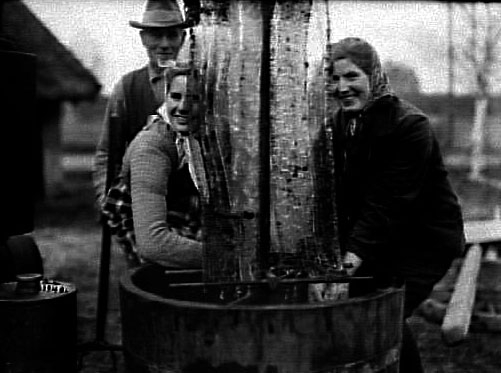 Vid en vattentunna med kylvatten till en fotogenmotor.