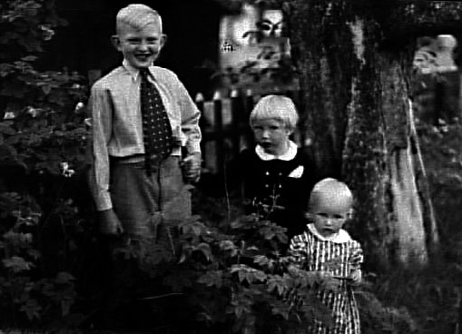 TRE BARN SOM STÅR VID ETT BUSKAGE