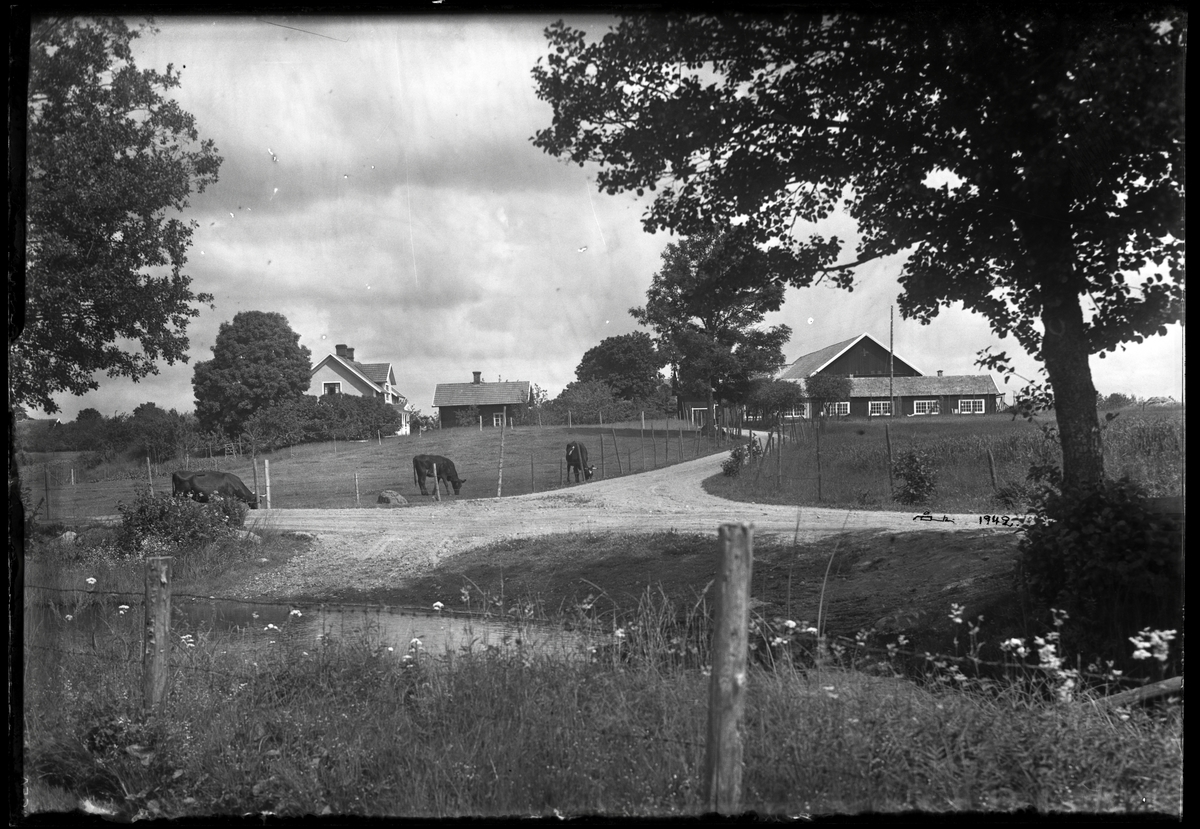 Kor på bete framför bondgård