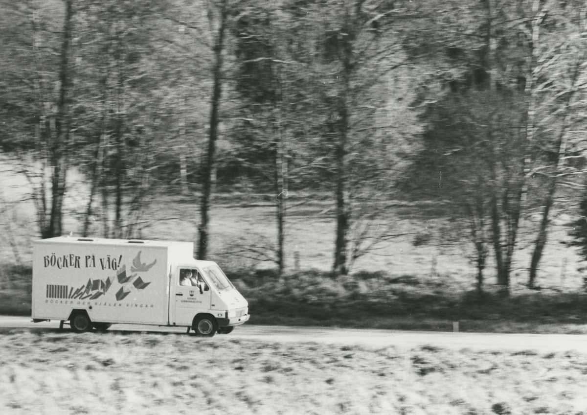Exteriör. Bokbussen. Ambulerande bibliotek på väg.