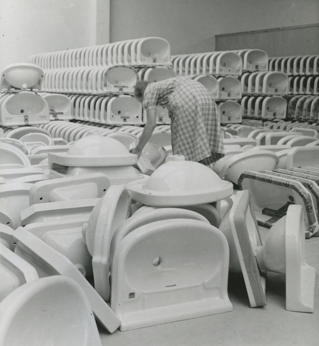 Interiörbild, Sanitetsporslinsfabriken. Sortering av handfat.