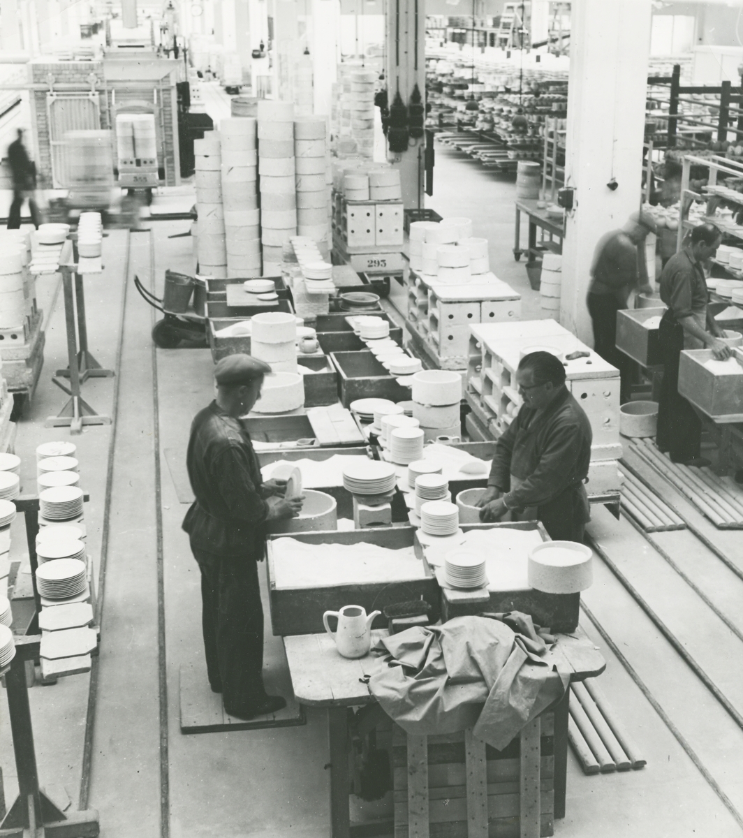 Interiörbild, Hushållsporslinsfabriken, tallriksproduktion.