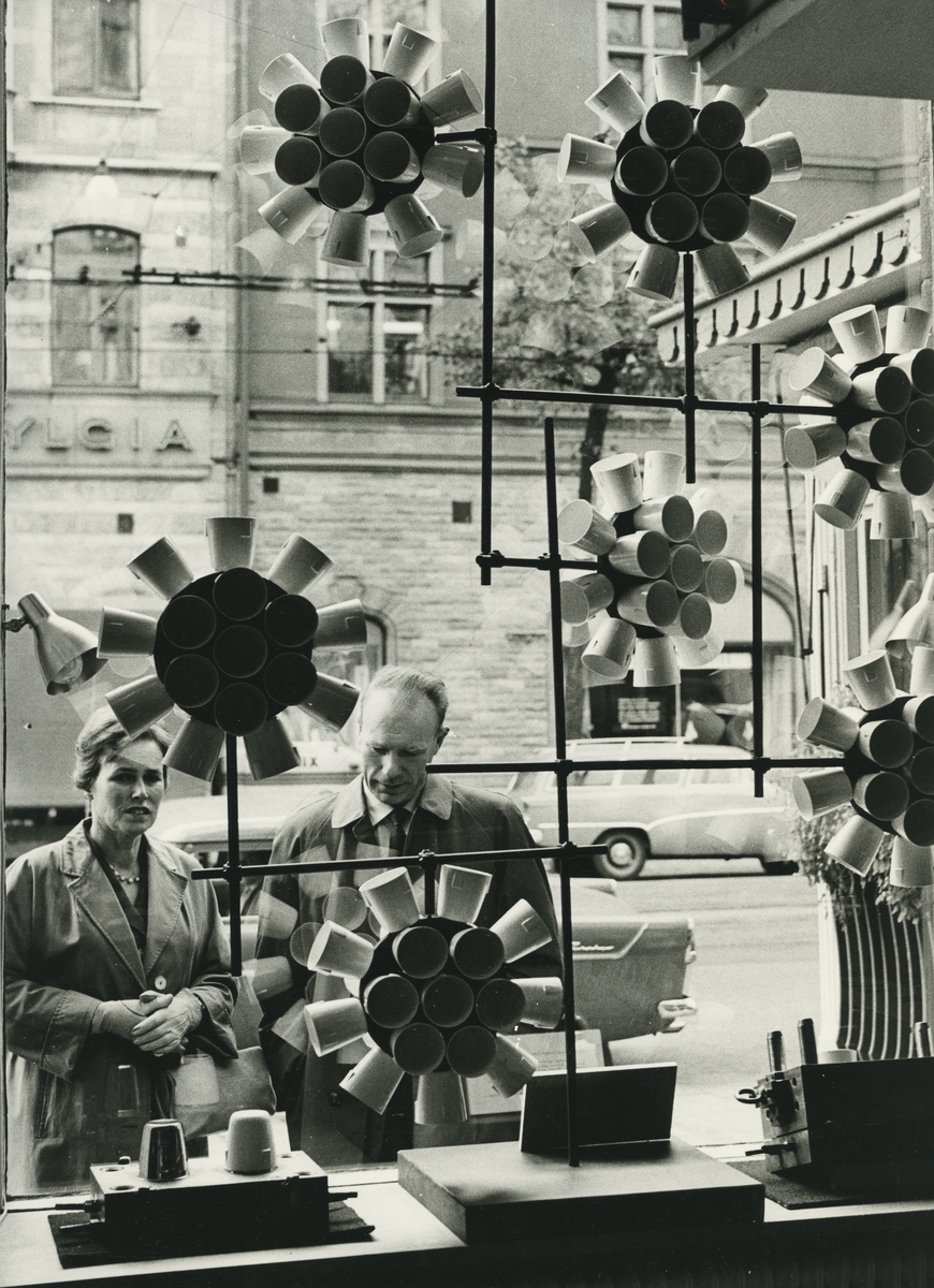 Skyltfönster med muggar från Gustavsbergs Fabriker. Okänd plats.