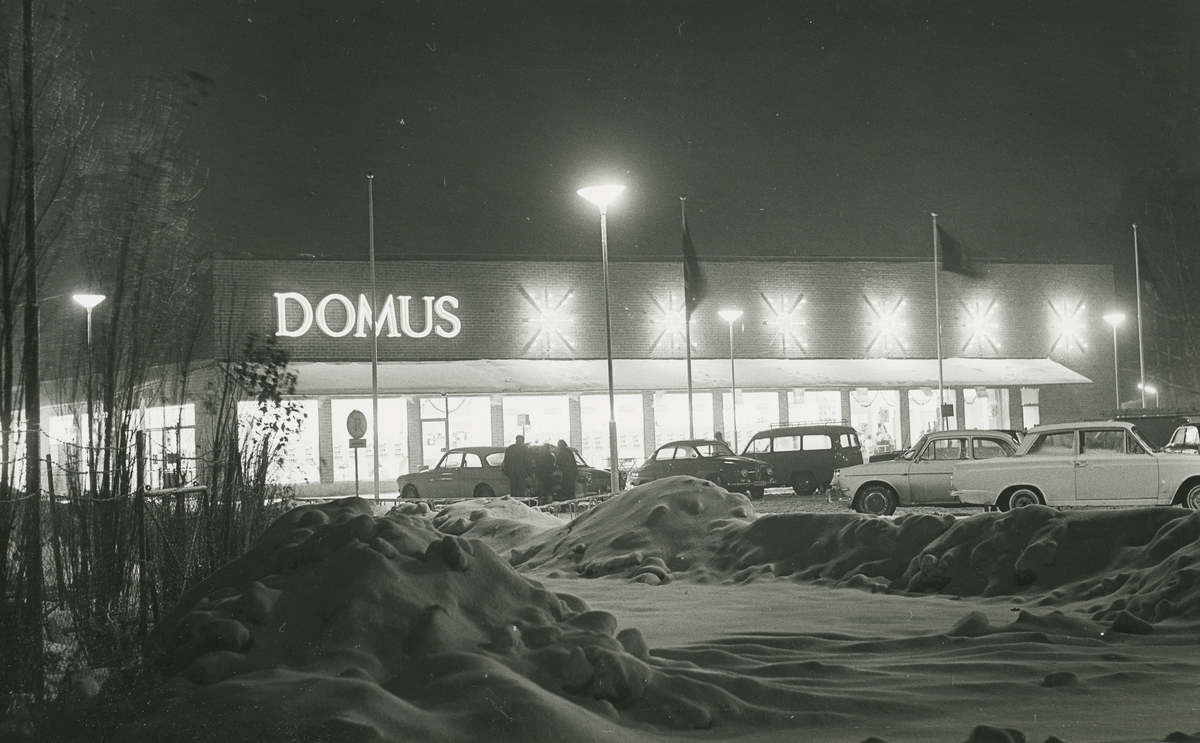 Exteriörbild i vintertid. Domus i kvällsljus, Gustavsbergs centrum.