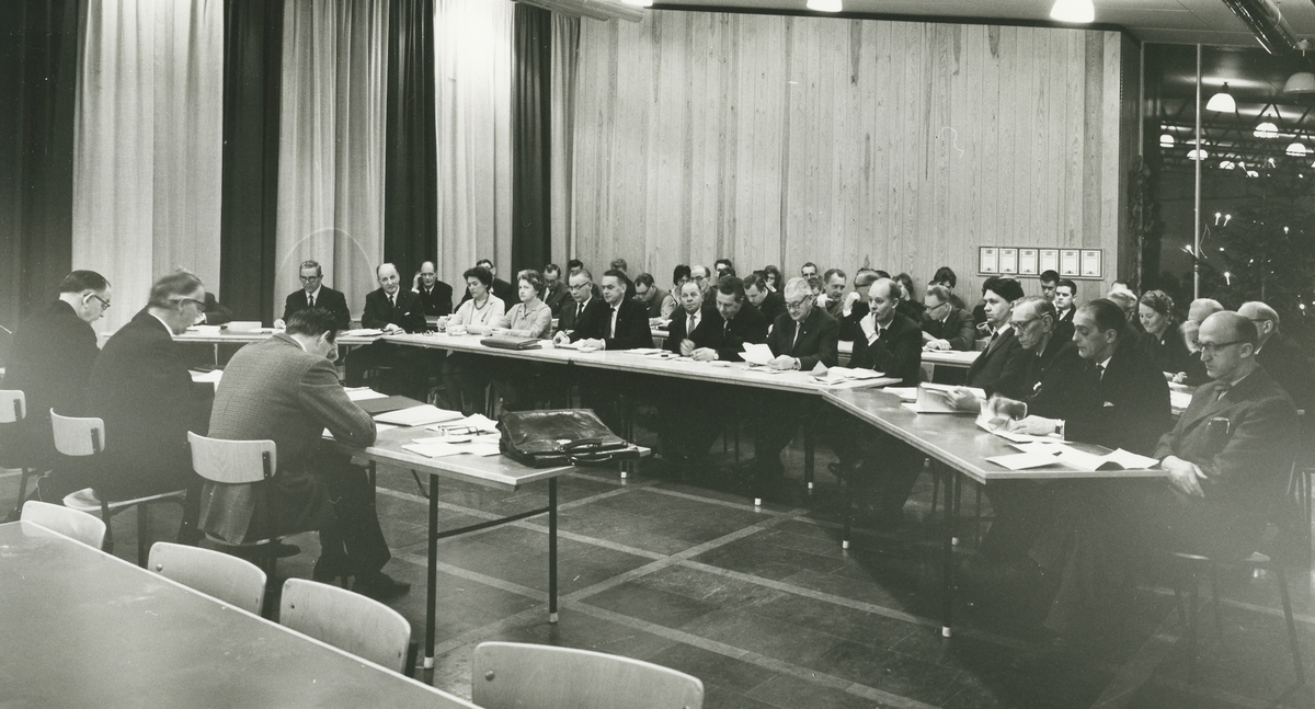 Interiörbild. Kommunfullmäktiges decembermöte i Kvarnbergsskolan, 1963.