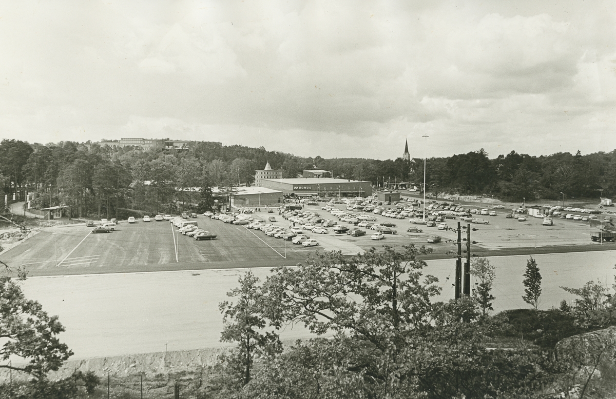 Exteriörbild. Domus och parkeringsplats, Gustavsbergs centrum.