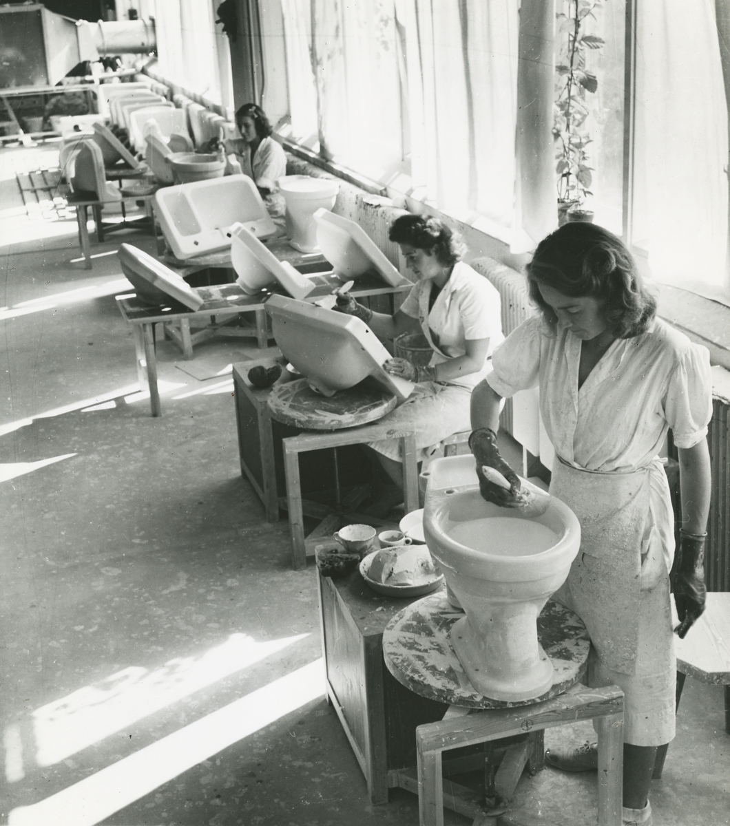 Interiör, Sanitetsporslinsfabriken. Penselglasering av rågodsbrända handfat och wc-stolar.