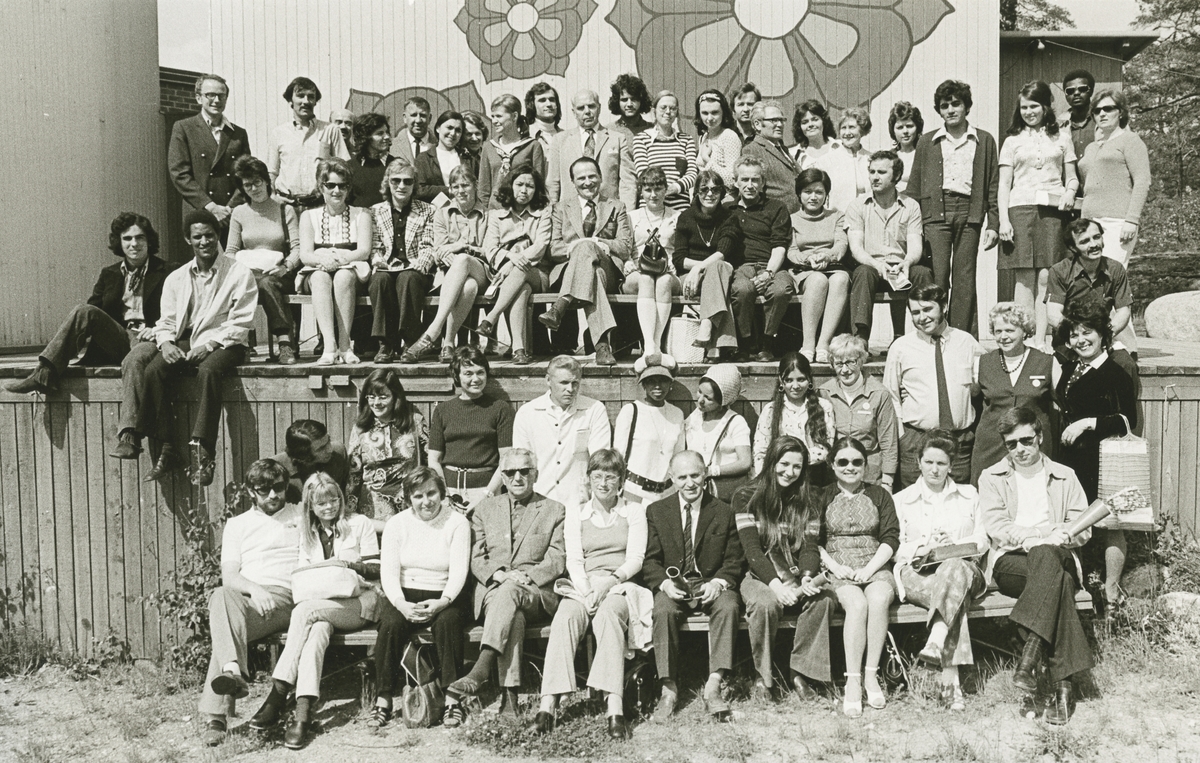 Exteriörbild. Sannolikt personal anställd vid Domus, Gustavsbergs centrum.