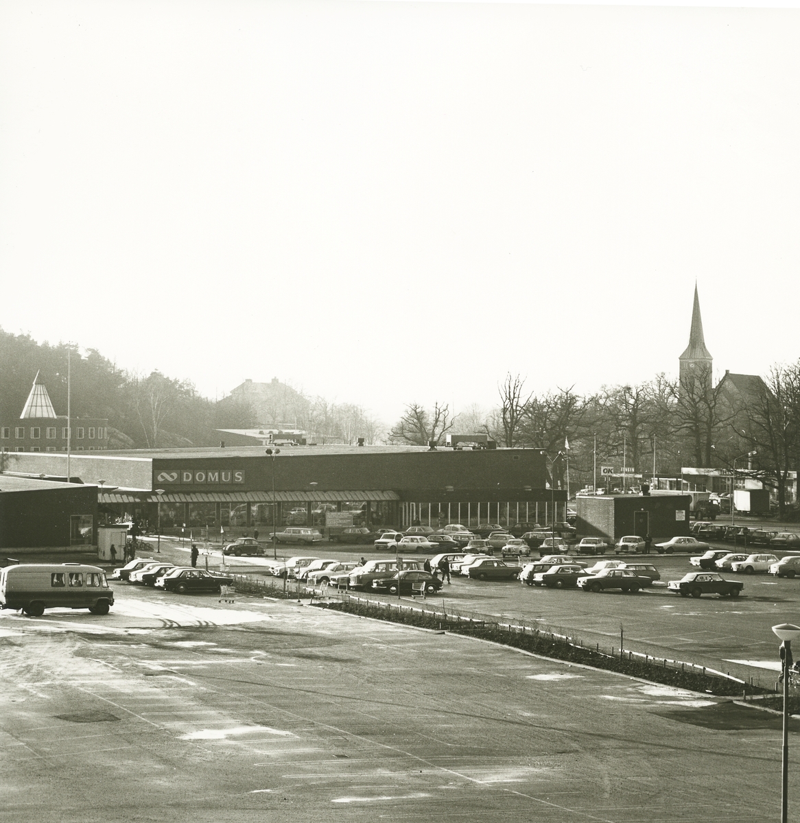 Exteriörbild. Bilparkering utanför Domus, Gustavsbergs centrum.
