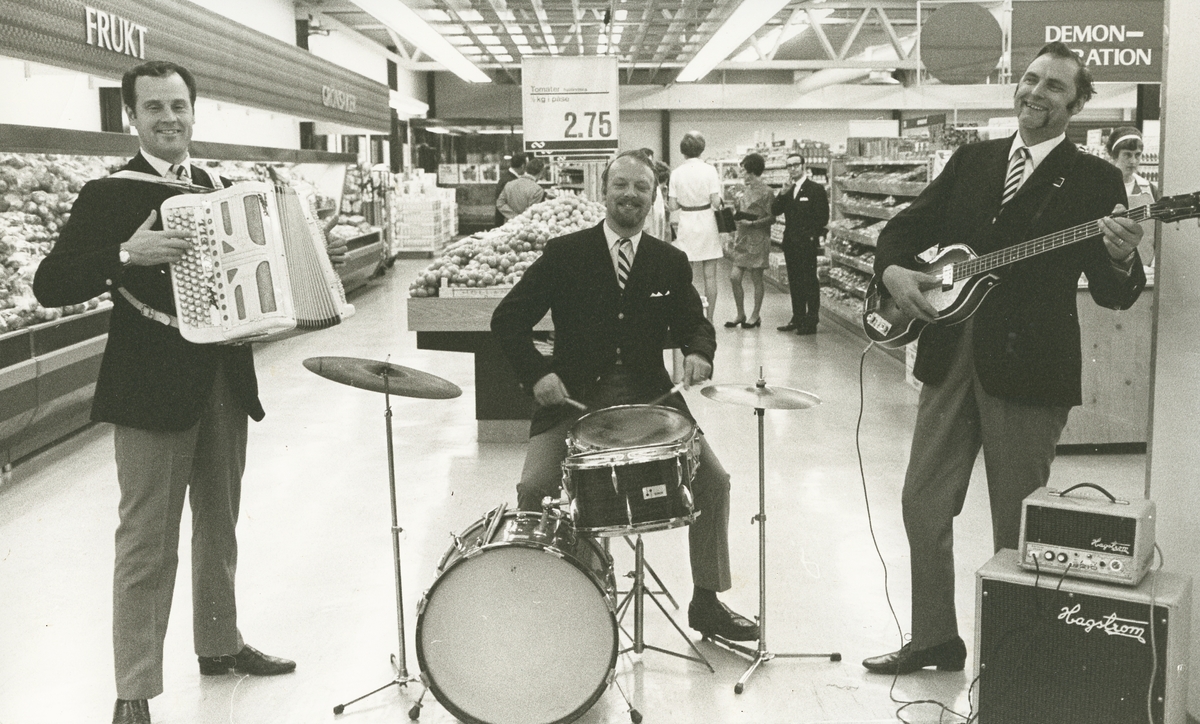 Interiörbild. Musikunderhållning i Domus varuhus, matvaruavdelningen. Gustavsbergs centrum.