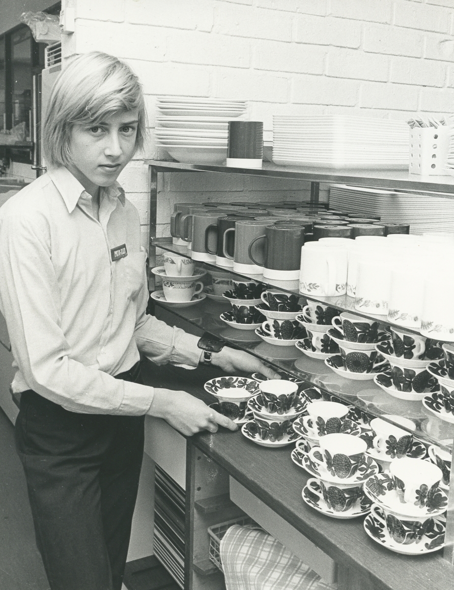 Interiörbild. Caféservering i Domus varuhus, Gustavsbergs centrum.