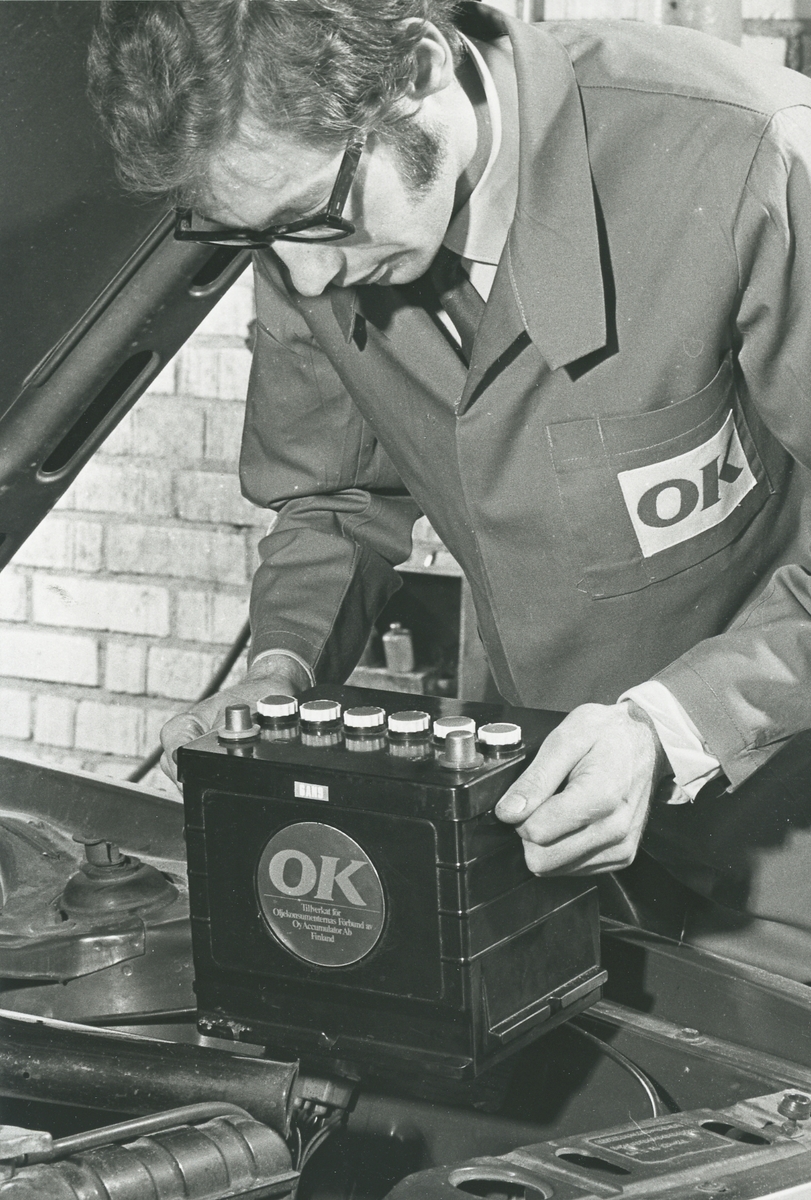 OK-macken, Gustavsbergs centrum. Personal undersöker bilbatteri.