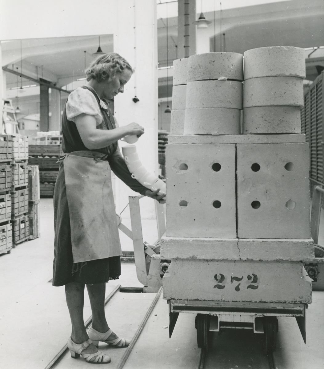 Interiörbild, Hushållsporslinsfabriken. Rågodsbränning av hushållsporslin under kriget.