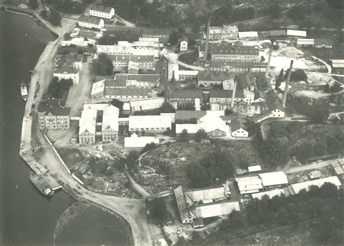 Exteriör. Flygfoto över Gustavsbergs fabriksområde med omnejd.