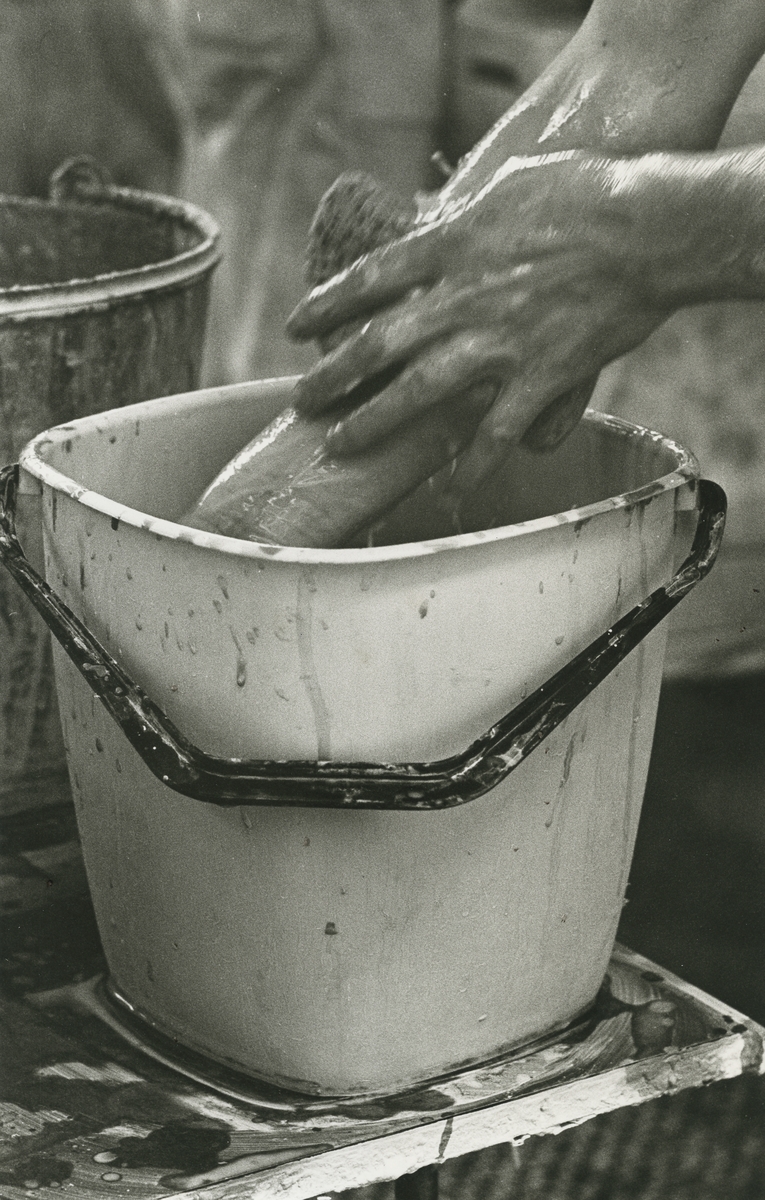 Detaljbild, Sanitetsporslinsfabriken. Fabriksarbetare rengör händerna från gjutslamma.<br>