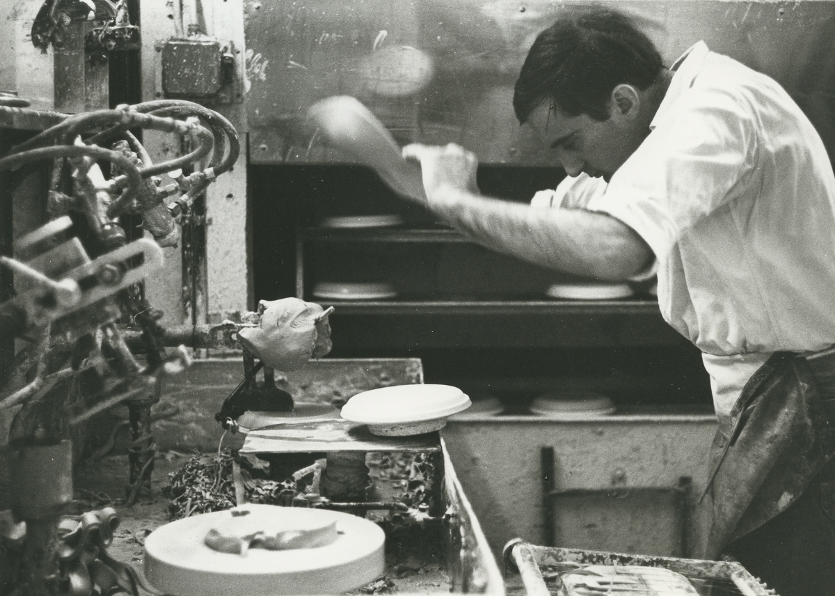 Interiör. Hushållsporslinsfabriken. Maskinell tallriksformning.