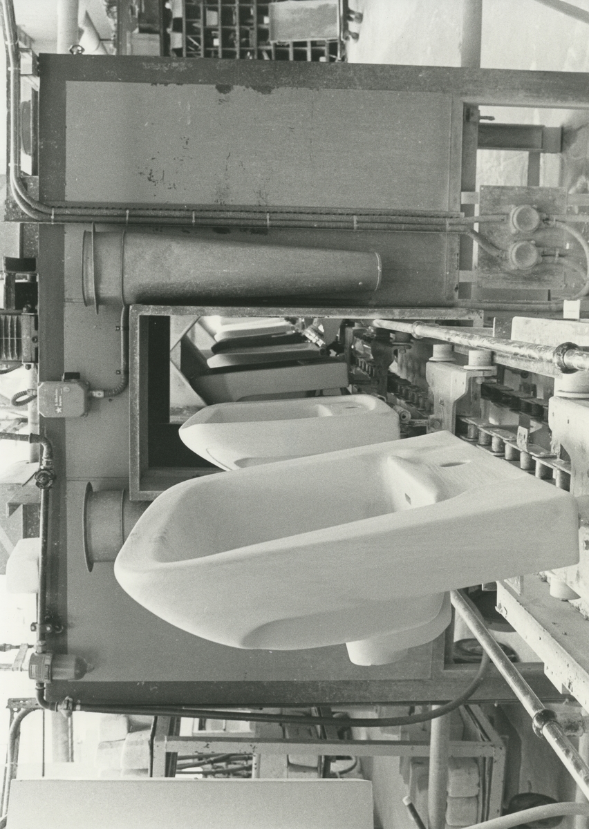 Interiörbild. Sanitetsporslinsfabriken. Löpande band transport av handfat.